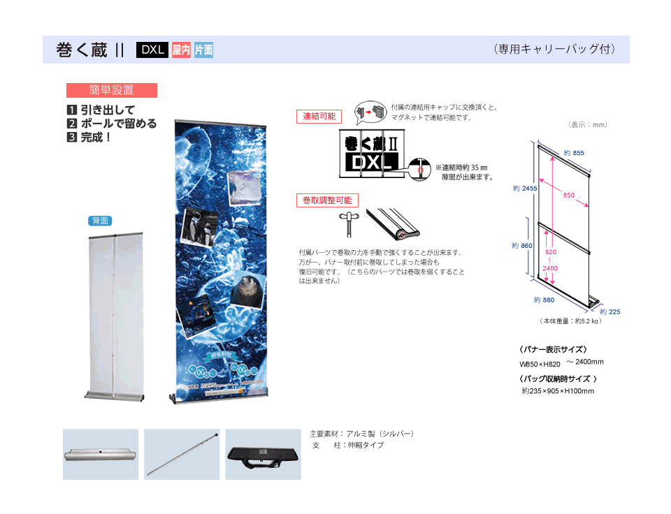 イベントや店舗の集客に欠かせない高品質なロールアップバナーを制作いたします。強いアイキャッチ効果のあるデザインで、目印としてもPRツールとしても活躍します。設置も撤去も簡単で、専用キャリーバッグ付きなので持ち運びもらくらくです。